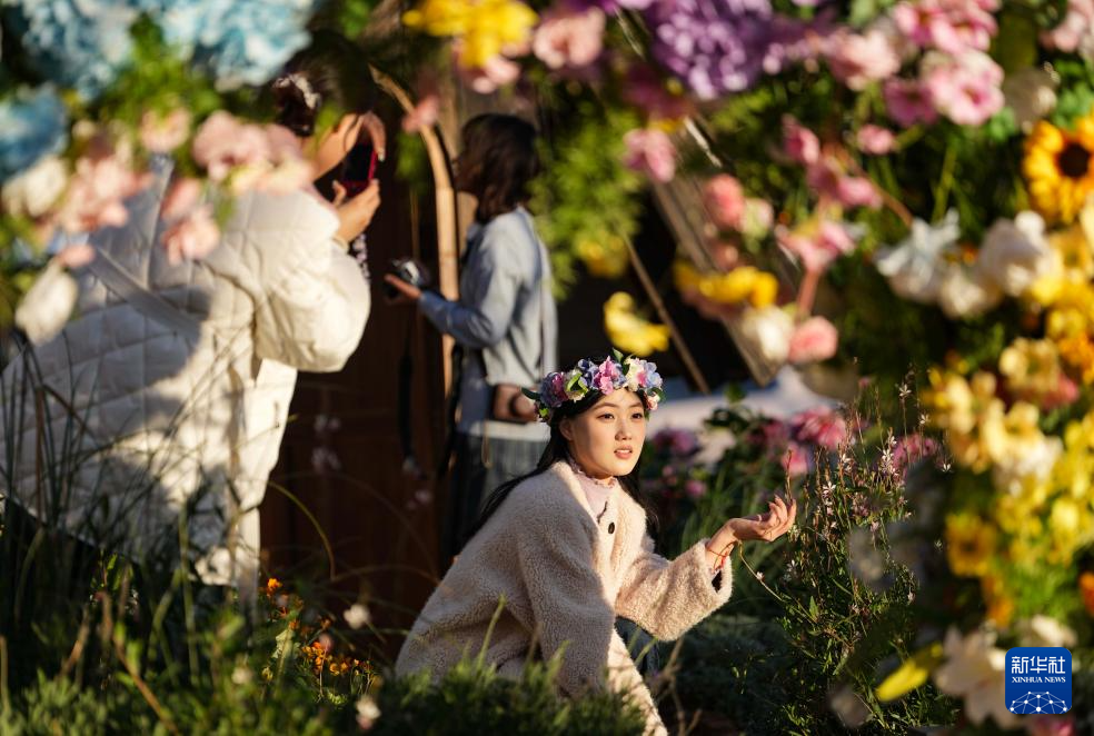 12月31日,游客戴着花环在昆明斗南花卉市场内拍照留念。