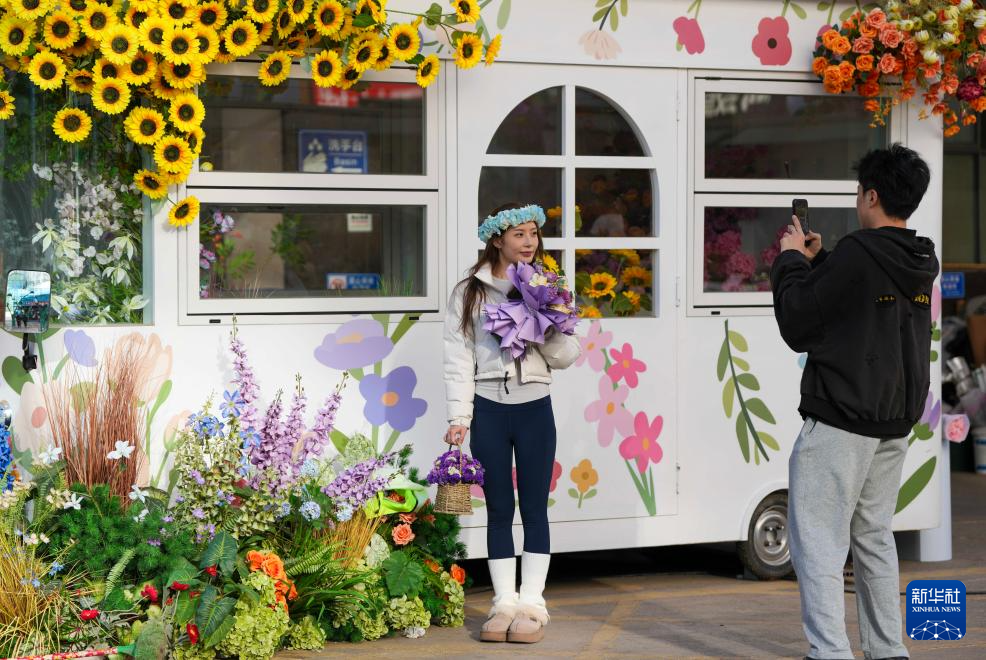 12月31日,游客选购完鲜花后在昆明斗南花卉市场内拍照。