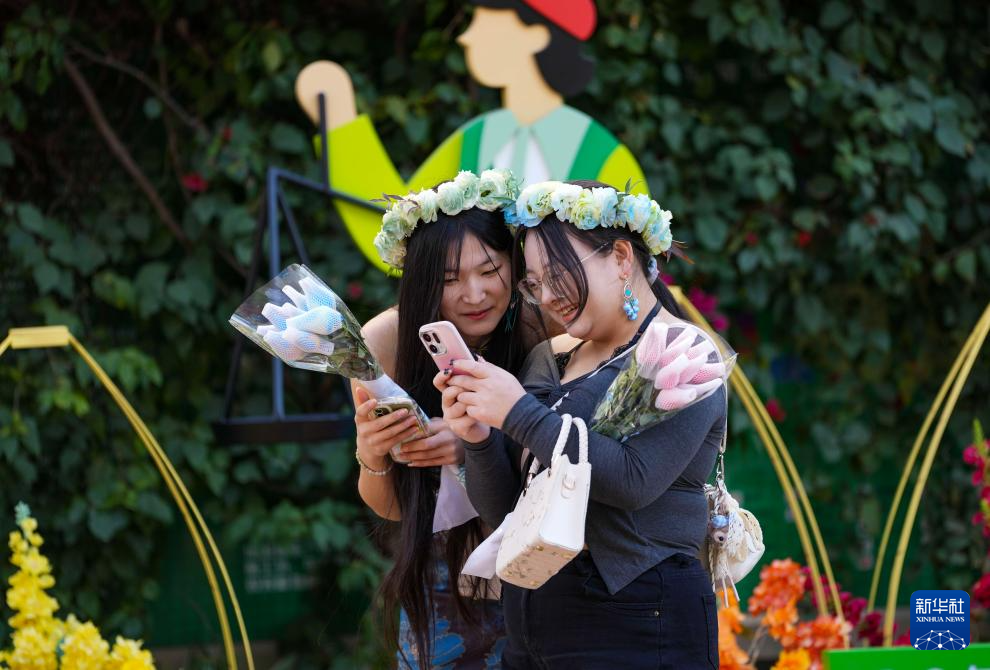 12月31日,两名游客在昆明斗南花卉市场内查看手机上的自拍照。