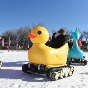 12月31日,游客在圆明园体验游乐项目“雪地转转”。
