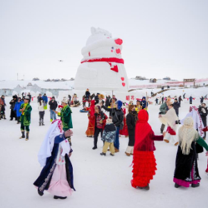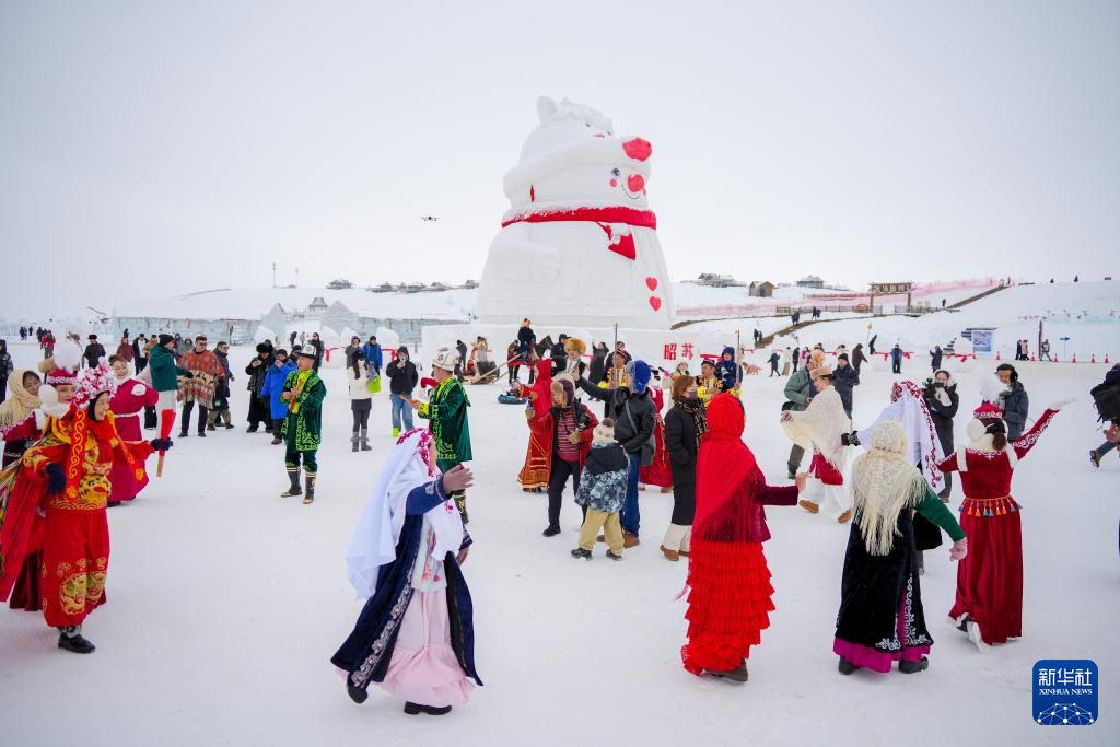 2026年1月1日,在新疆昭苏县湿地公园,演员与游客共同跳舞。