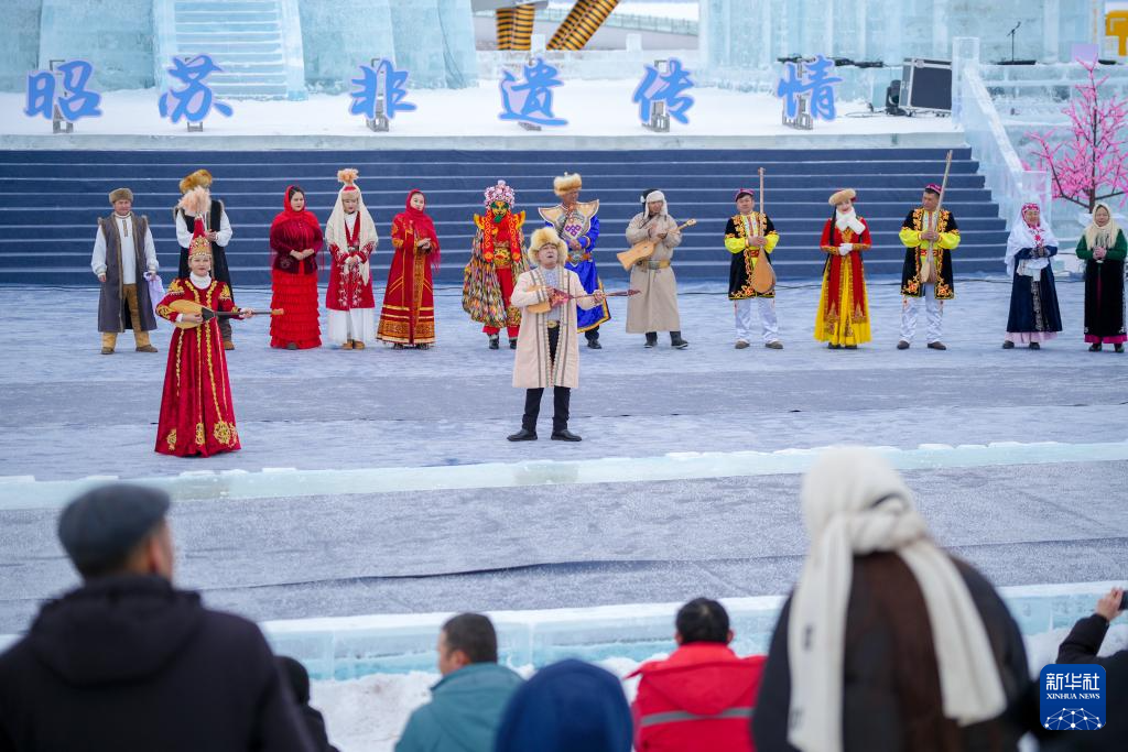 新年第一天,新疆昭苏县在当地湿地公园举办非遗游园活动,为游客展演哈萨克族传统婚俗、《玛纳斯》说唱、《江格尔》情景表演等非遗节目。
