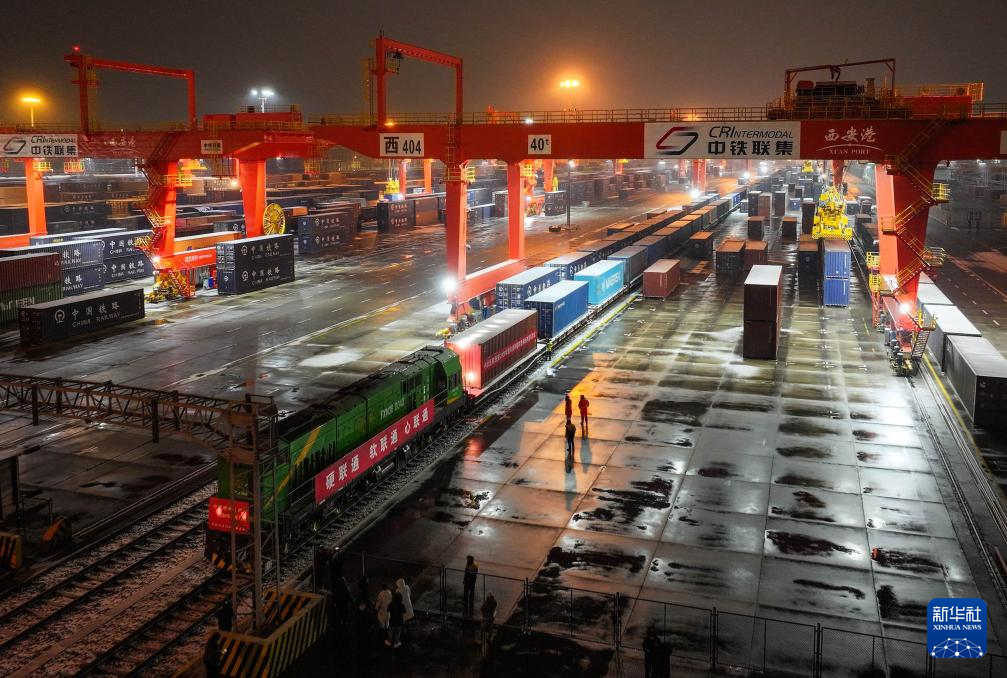 2025年12月31日夜,中欧班列(西安)2026年新年首列暨跨里海国际运输走廊班列在西安国际港站等待发车。