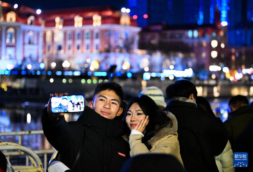 2025年12月31日晚,人们在天津海河沿岸欣赏灯光秀时自拍,迎接新年。