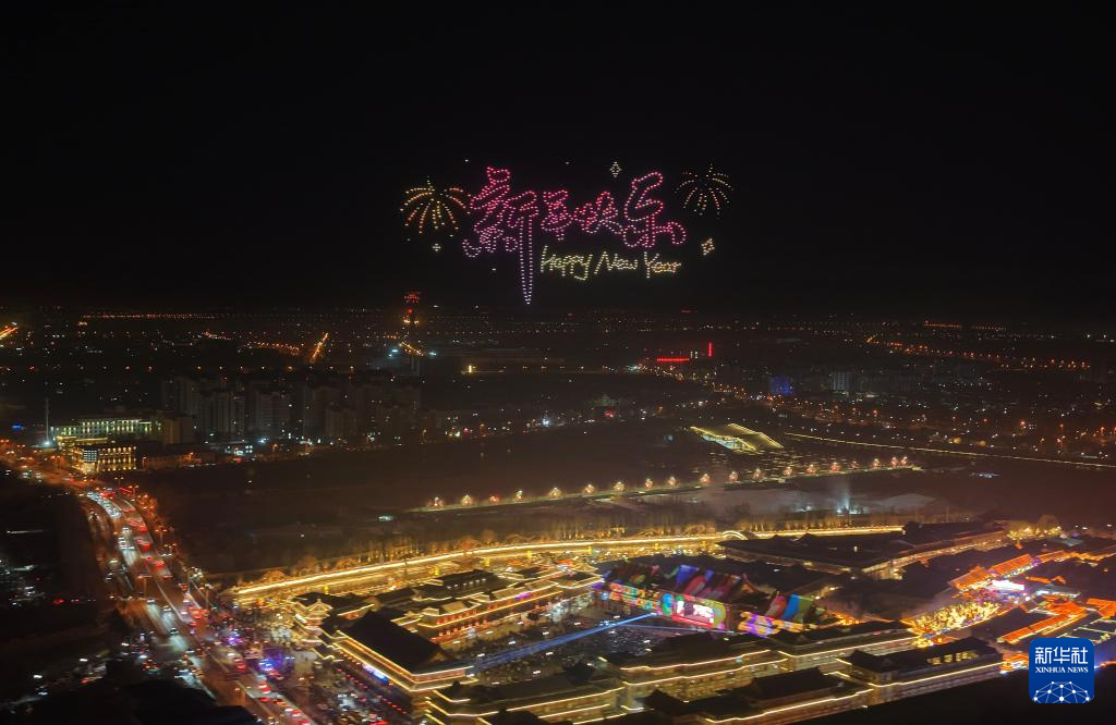 2026年1月1日凌晨在天津市西青区杨柳青古镇拍摄的无人机表演(无人机照片)。