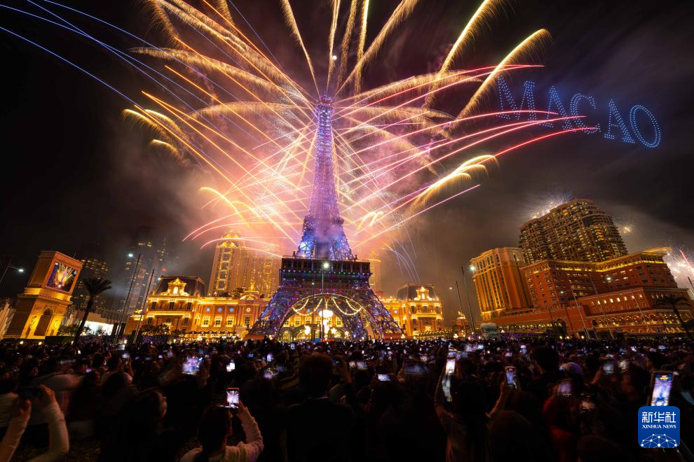 2026年1月1日凌晨,人们在澳门路氹金光大道观看新年烟花汇演。