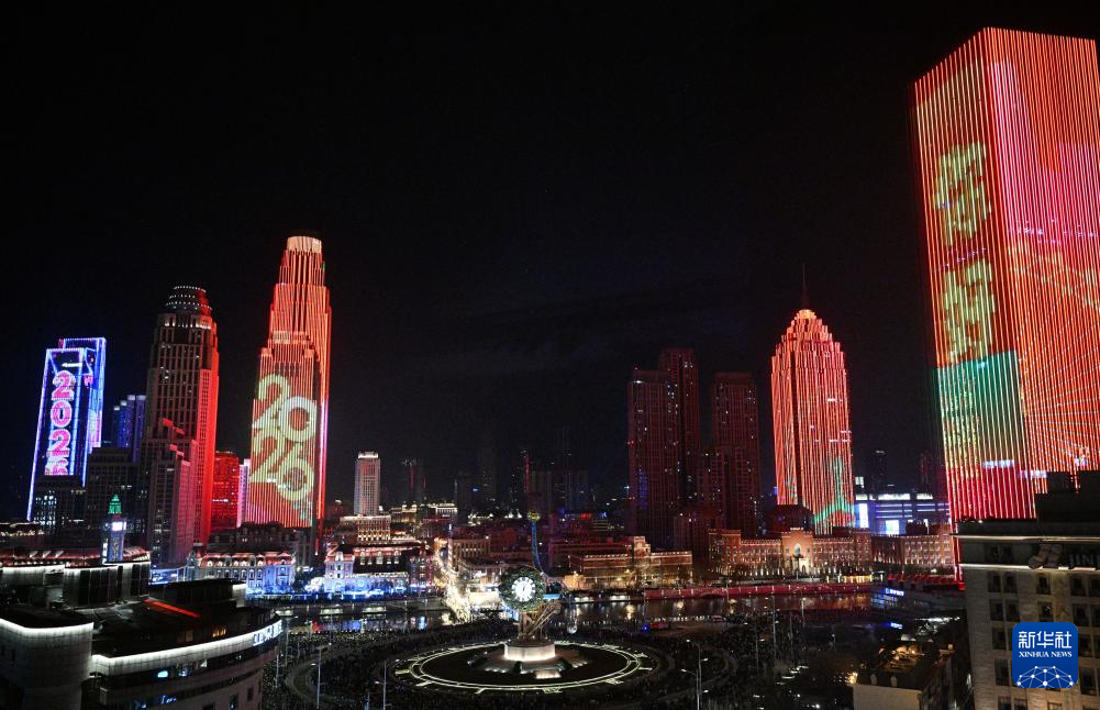 2026年1月1日凌晨拍摄的天津新年楼体灯光秀。