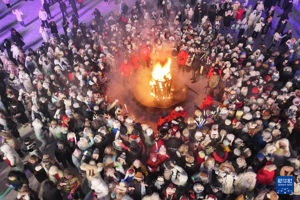 2025年12月31日晚,人们在黑龙江省漠河市北极村围着篝火迎接新年(无人机照片)。