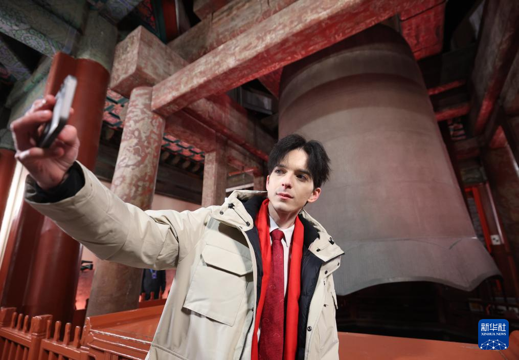 2026年1月1日凌晨,来自北京大学国际关系学院的俄罗斯留学生在北京大钟寺古钟博物馆敲响永乐大钟后拍照留念。