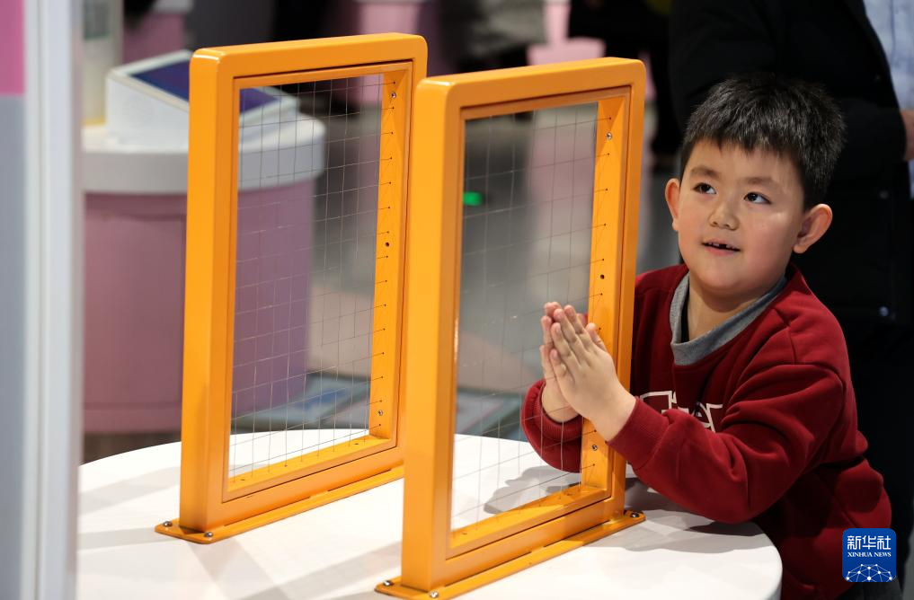 1月2日,小朋友在山东省滨州市科技馆体验“天鹅绒触觉”项目。