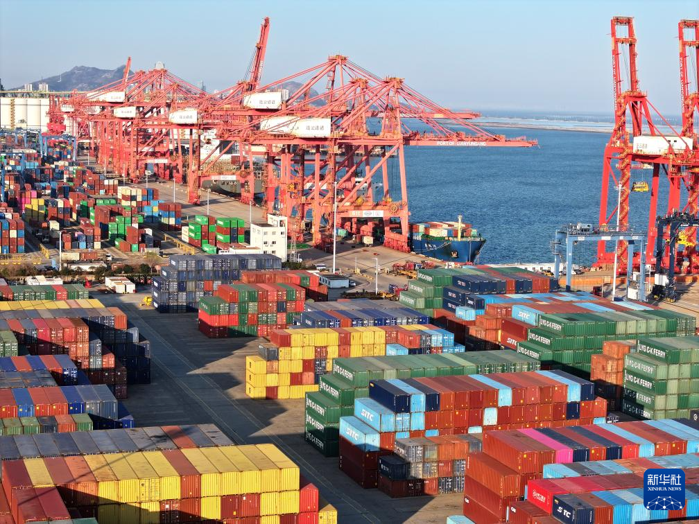 1月2日,货轮停在江苏省连云港港集装箱码头泊位装卸集装箱(无人机照片)。