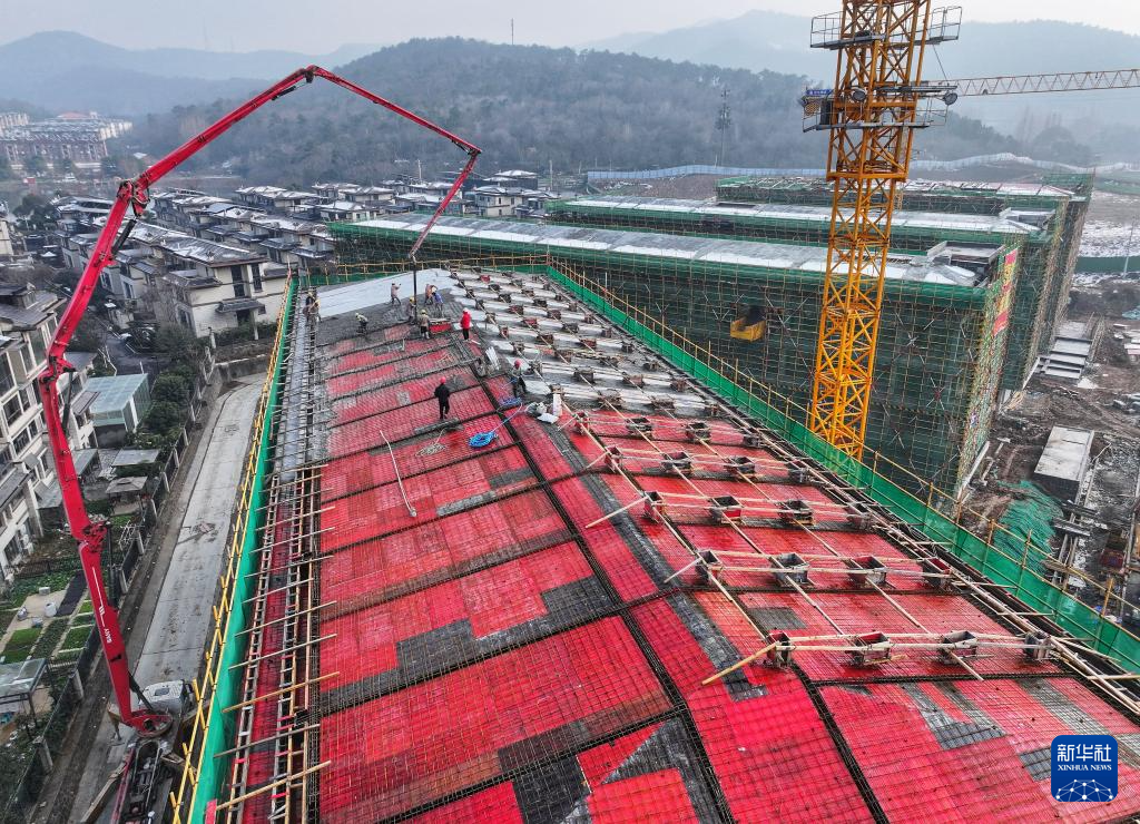 1月2日,工人在湖北省襄阳市麒麟中学建设项目工地浇筑屋面水泥(无人机照片)。