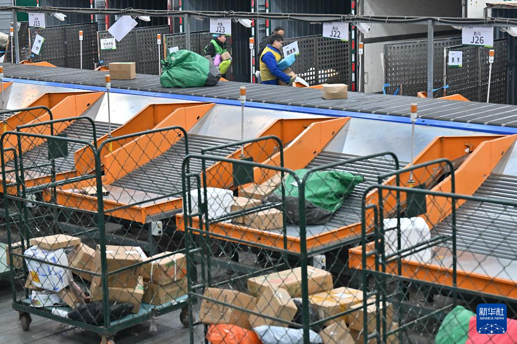 1月2日,工作人员在中国邮政集团有限公司商丘市分公司邮件处理中心搬运快递。