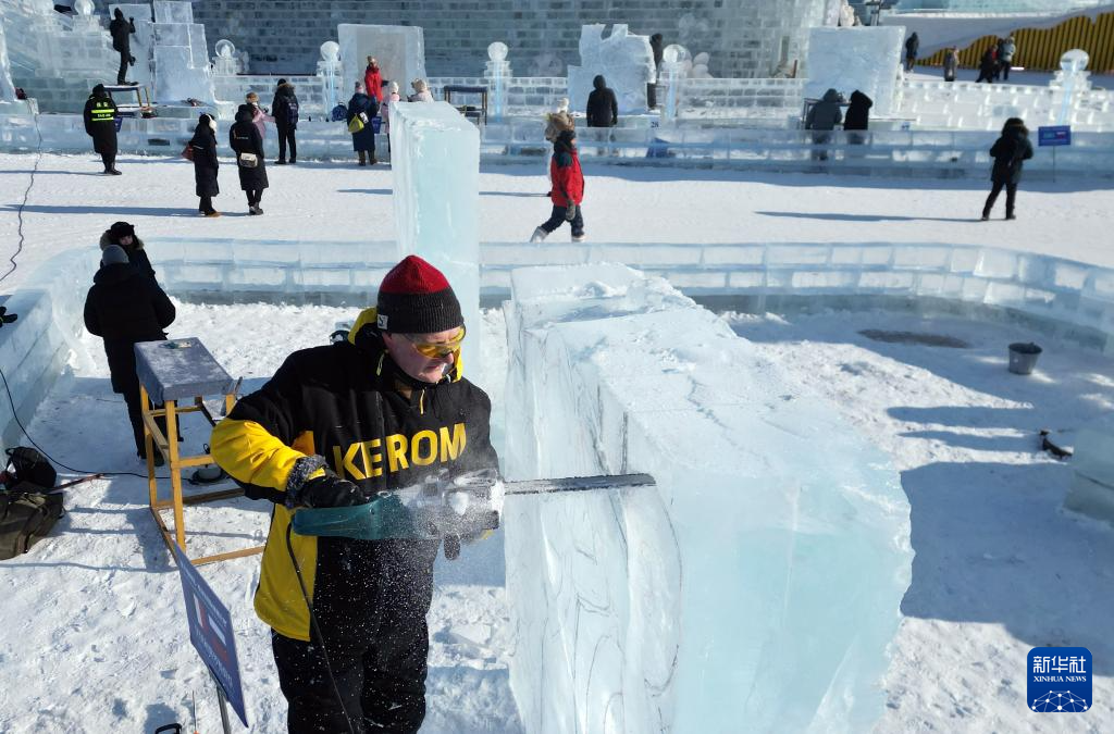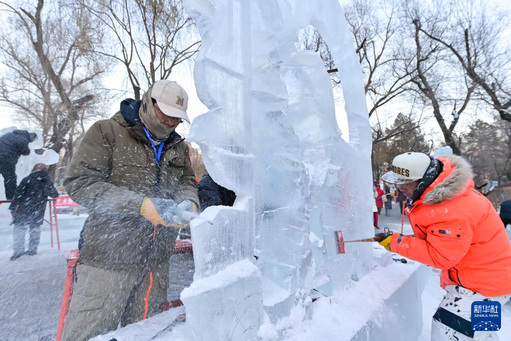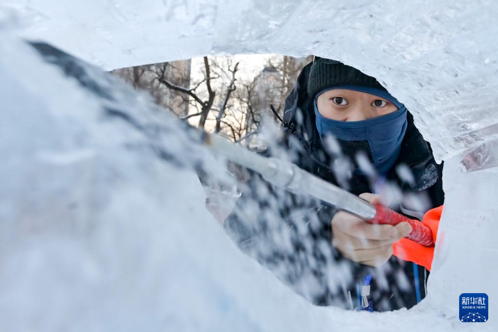 元旦假期,冰雕师在哈尔滨多个冰雪景点创作冰雕,扮美“冰城”。