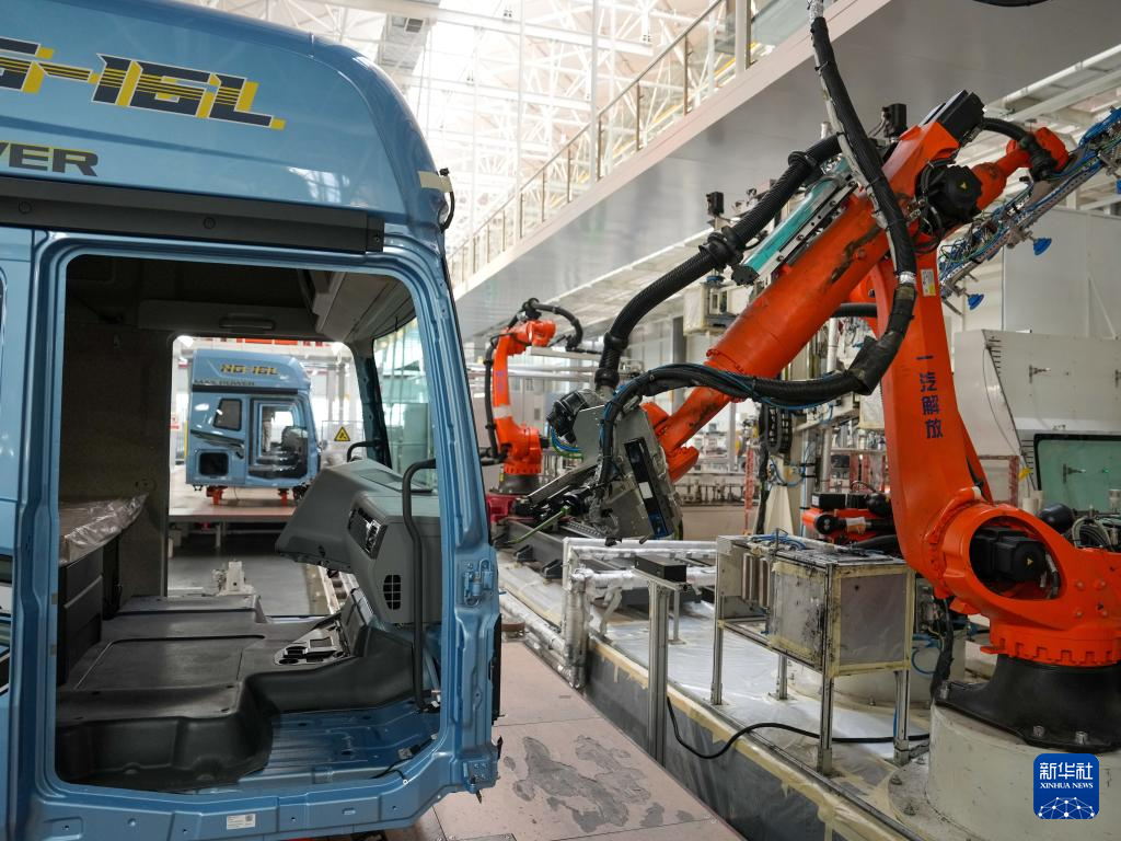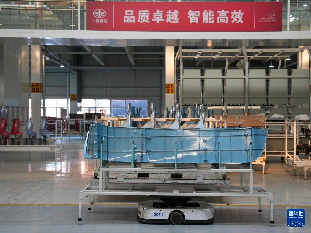 1月4日,在一汽解放J7整车智能工厂,机器人搬运车辆零部件。