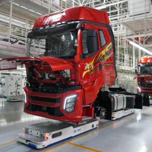 1月4日,在一汽解放J7整车智能工厂,机器人搬运车辆行进在生产线上。