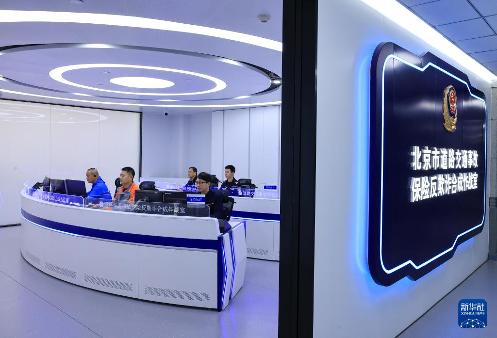 1月7日,在北京市道路交通事故警保合作远程处理中心的交通事故保险反欺诈合成作战室,民警与工作人员在分析研判有诈保嫌疑的交通事故。