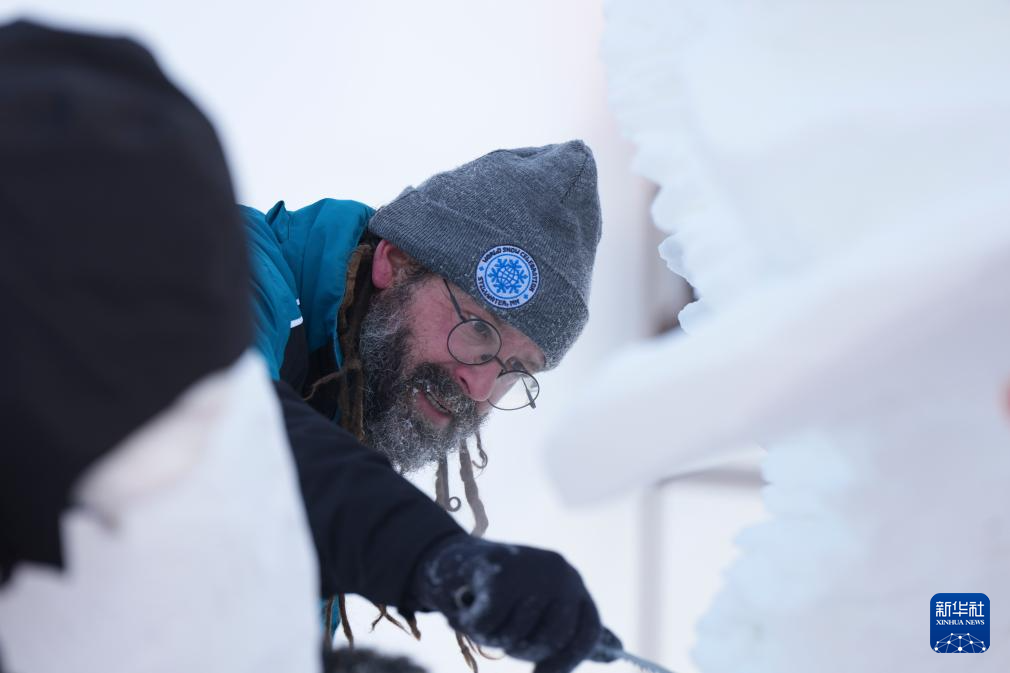 1月9日,中国一队参赛选手在进行雪雕作品《噬》收尾工作,作品最终获得三等奖。