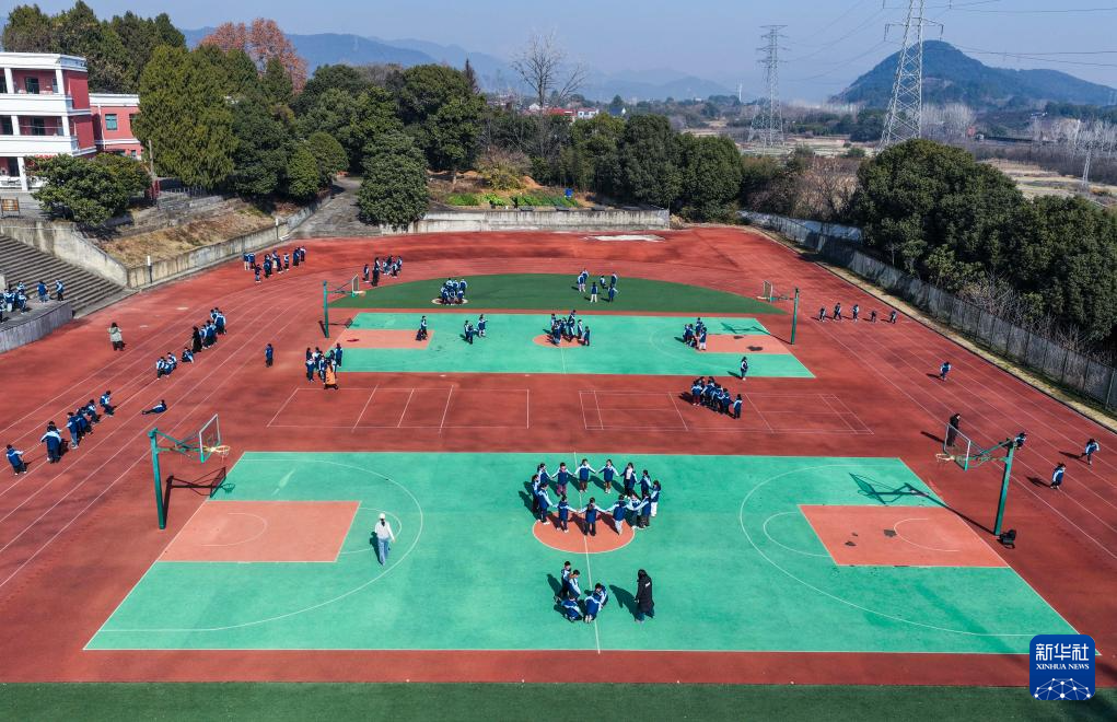 1月9日,在诸暨市陶朱街道白门完小的操场上,学生们正在参加传统游戏课(无人机照片)。