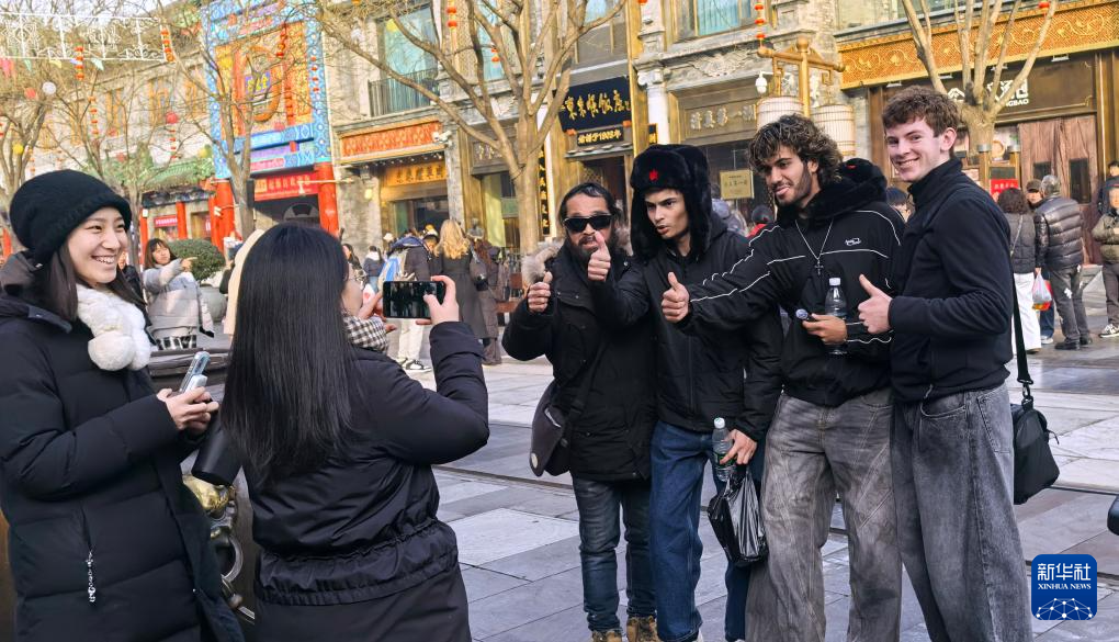 游人在前门商业街上拍照留念(1月15日摄)。