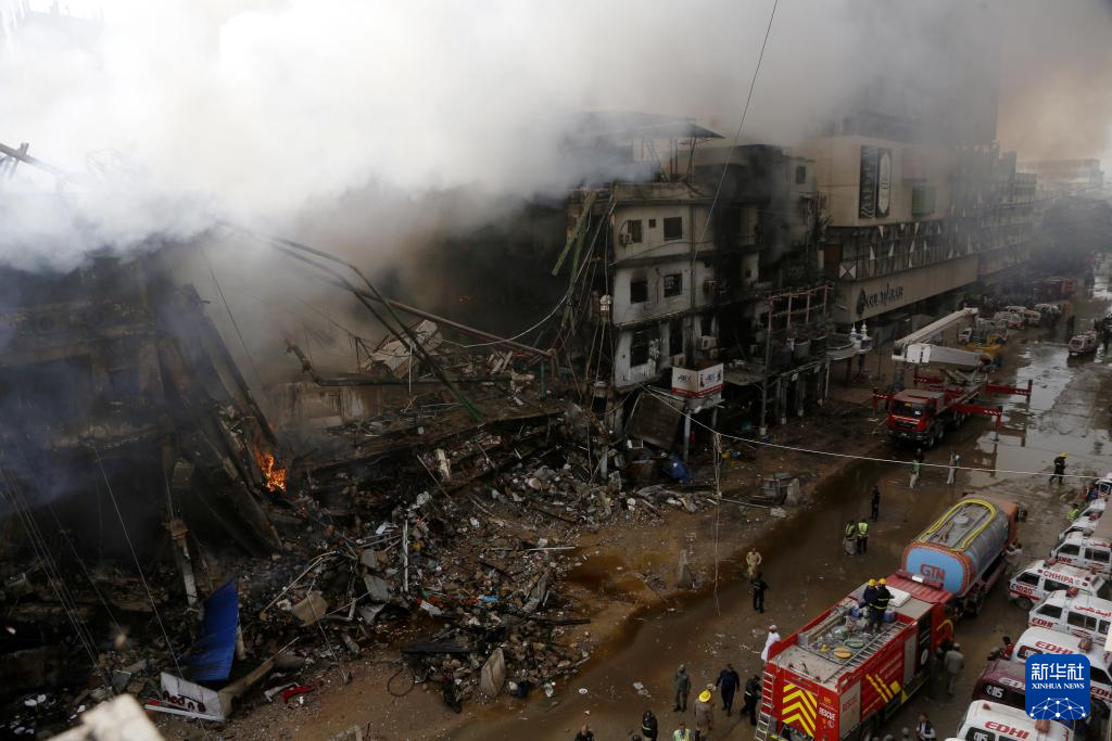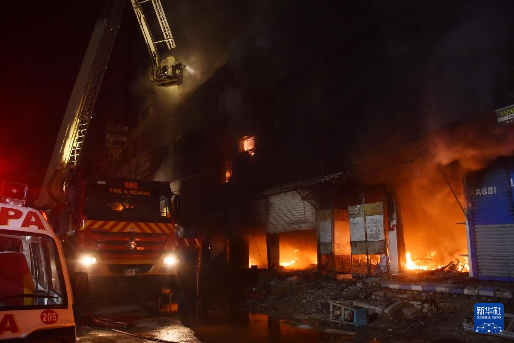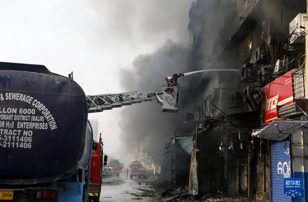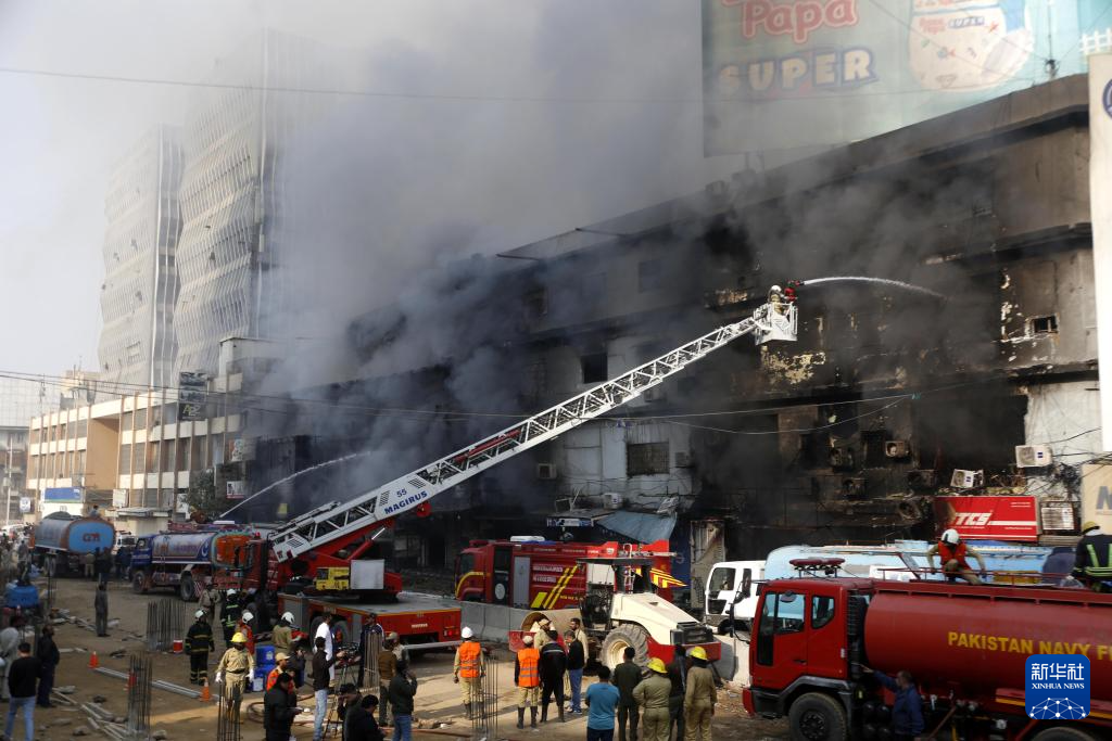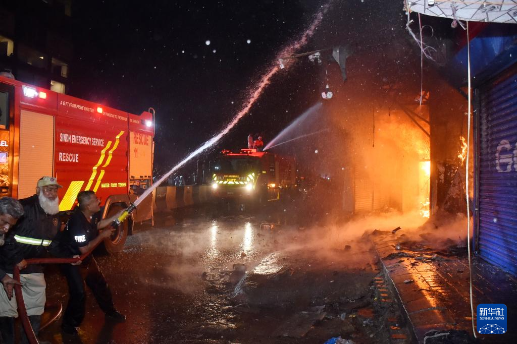 1月18日,消防员在巴基斯坦卡拉奇的火灾现场灭火。