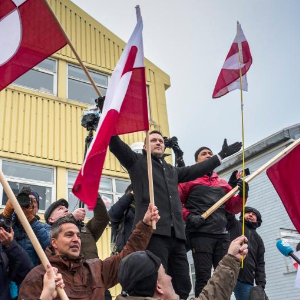 1月17日,在丹麦自治领地格陵兰岛首府努克,格陵兰岛自治政府总理延斯-弗雷德里克·尼尔森(中)与当地民众参加示威游行。