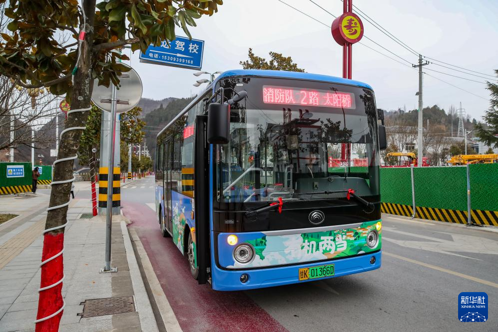 1月18日,一辆免费公交在甘肃省陇南市两当县的街道上。