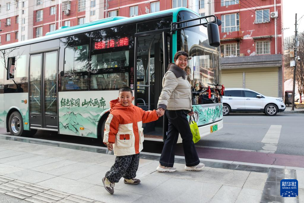 1月17日,在甘肃省陇南市两当县,祖孙二人乘坐免费公交到站后手牵手回家。