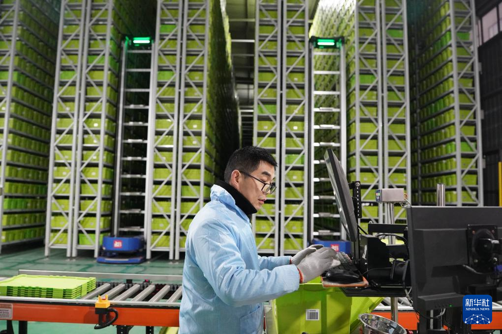 1月20日,在江西瑞金漫格科技有限公司库房内,工作人员操作智能机器人抓取积木产品进行打包。