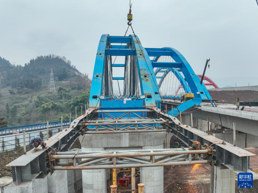 1月22日,工人在西渝高铁跨营达高速公路大桥进行施工作业。