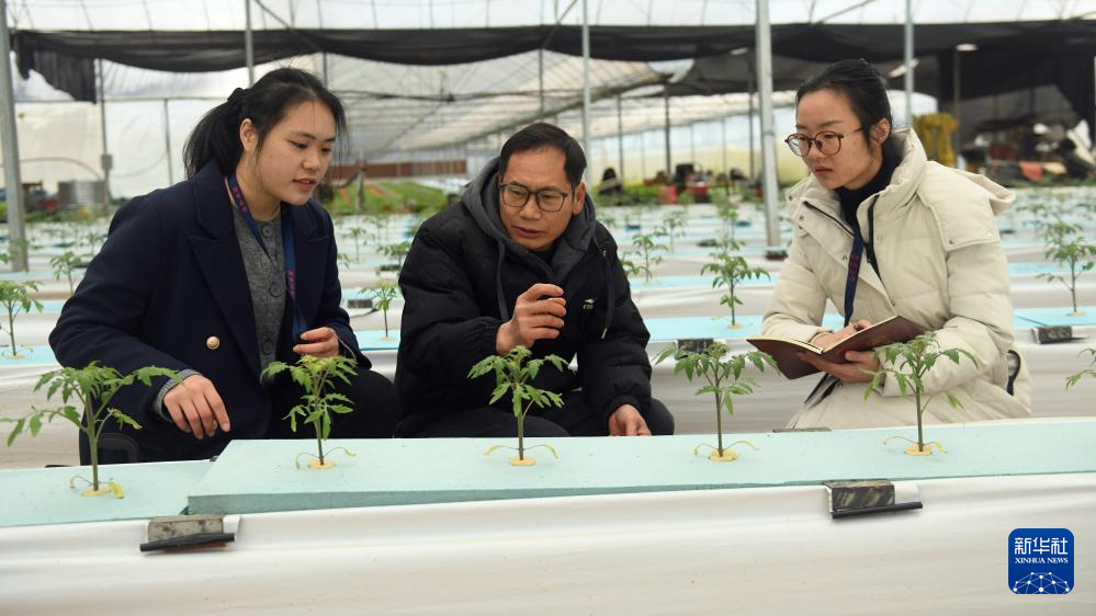 1月22日,在三江侗族自治县程村乡头坪村滩底坪屯,基层干部向菜农李记荣(中)了解西红柿苗无土培育项目的落实情况。