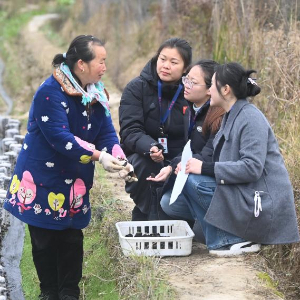 1月23日,在三江侗族自治县八江镇八斗村,基层干部吴晓洁(左)帮村民采收木耳的同时了解项目落实情况。