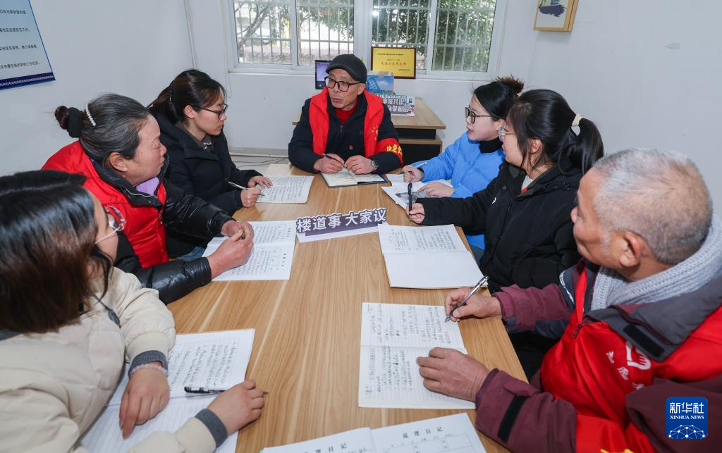 1月23日,在诸暨市陶朱街道友谊社区,社区干部、楼道长、网格员等开会讨论小区内各项需要解决的问题及节前工作安排。
