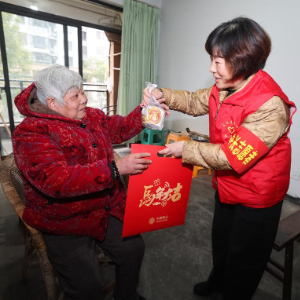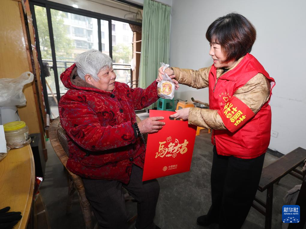 1月23日,在诸暨市陶朱街道友谊社区云泰家园,楼道长(右)上门看望独居老人并送上腊八粥和新春对联。