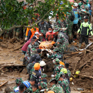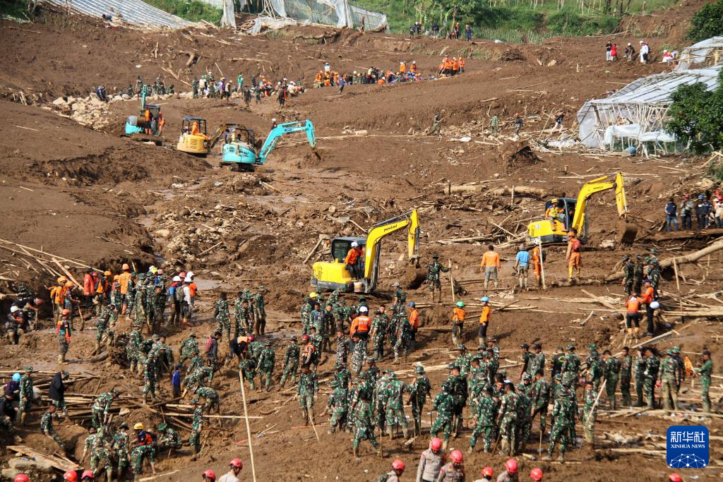 1月26日,在印度尼西亚西爪哇省西万隆县,救援人员在山体滑坡现场工作。