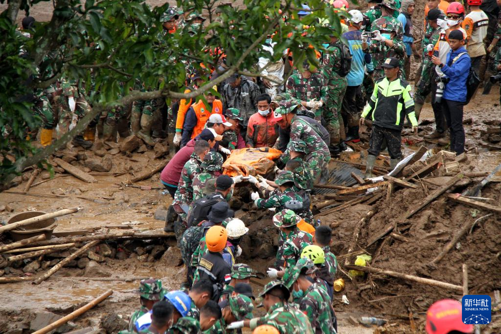 1月26日,在印度尼西亚西爪哇省西万隆县,救援人员在山体滑坡现场运送遇难者遗体。