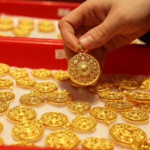 1月28日,顾客在位于浙江省杭州市萧山区瓜沥镇的杭州航民百泰首饰有限公司展厅挑选黄金首饰。