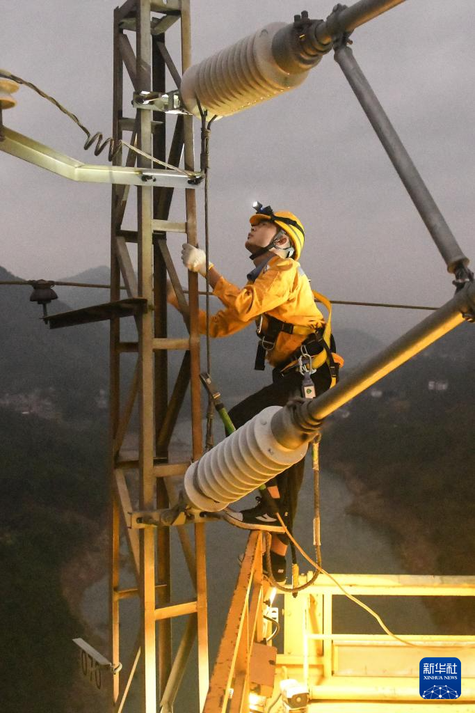 1月29日,中国铁路南宁局集团有限公司接触网工在检查接触网腕臂装置与补偿滑轮的状态。