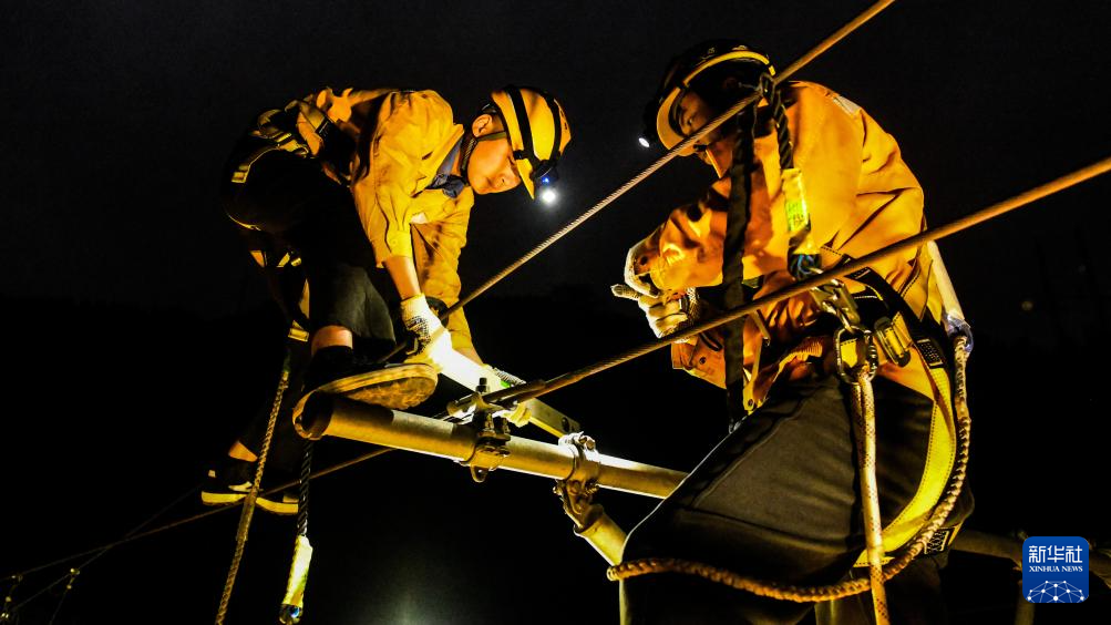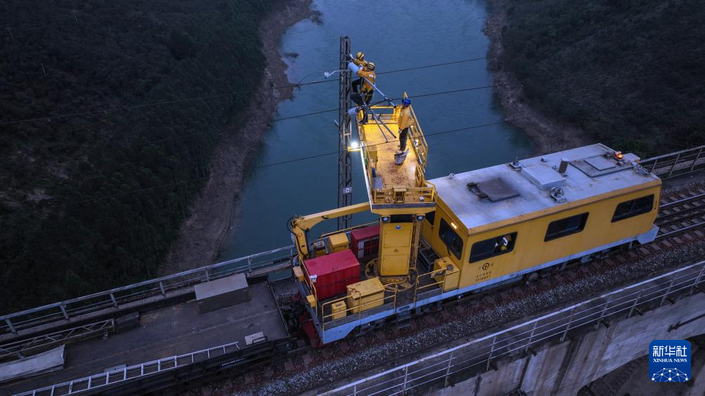 1月29日,中国铁路南宁局集团有限公司南宁供电段的接触网工在南盘江铁路大桥上检修接触网设备。