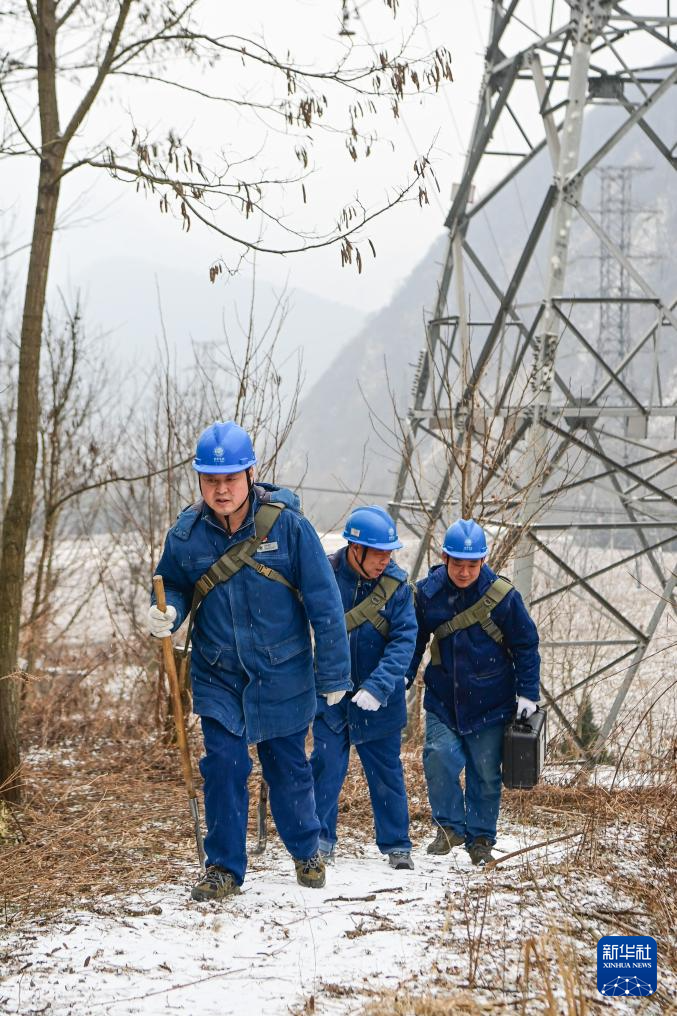 1月29日,国网宝鸡供电公司输电运检中心秦岭输电运维班班长周红亮(右)、副班长令云(中)、副班长薛龙在宝鸡市凤县黄牛铺镇东河桥村附近进行线路覆冰巡检。