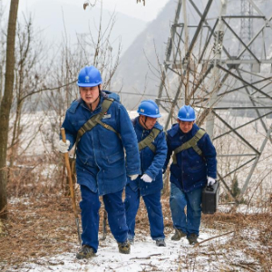 1月29日,国网宝鸡供电公司输电运检中心秦岭输电运维班班长周红亮(前)、副班长令云(中)、副班长薛龙在宝鸡市凤县黄牛铺镇东河桥村附近进行线路覆冰巡检。