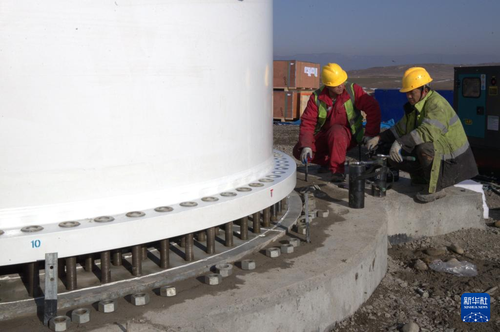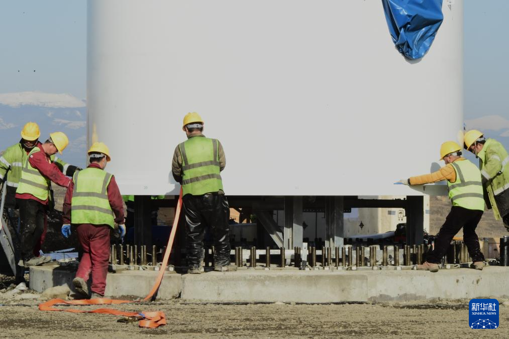 1月29日,在格鲁吉亚什达-卡尔特里大区鲁伊西风电项目现场,工人正在安装风机。