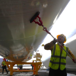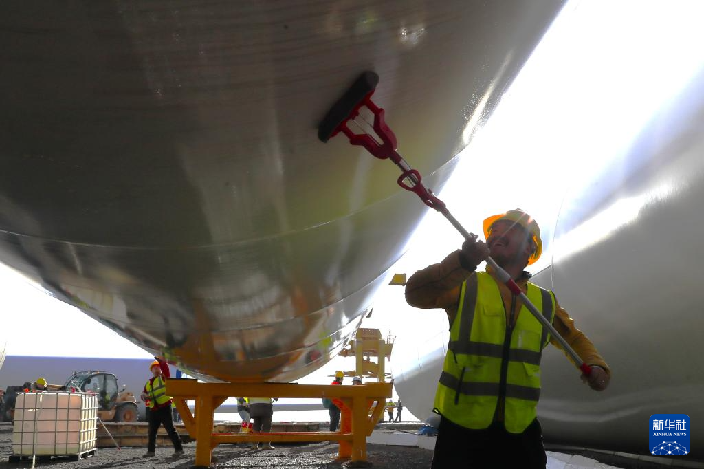 1月29日,在格鲁吉亚什达-卡尔特里大区鲁伊西风电项目现场,一名工人清理塔筒。
