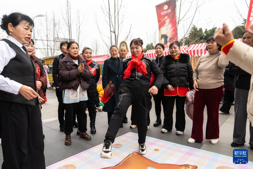 2月3日,在长沙市望城区大泽湖街道金星北路社区,市民参与踢毽子游戏。