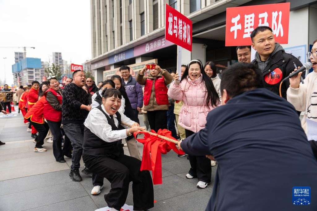 2月3日,在长沙市望城区大泽湖街道金星北路社区,市民进行拔河比赛。