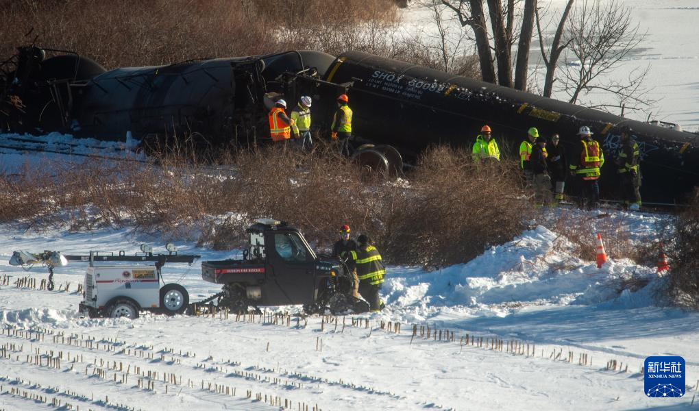 2月5日,在美国康涅狄格州曼斯菲尔德镇附近,工作人员在脱轨事故现场展开工作。
