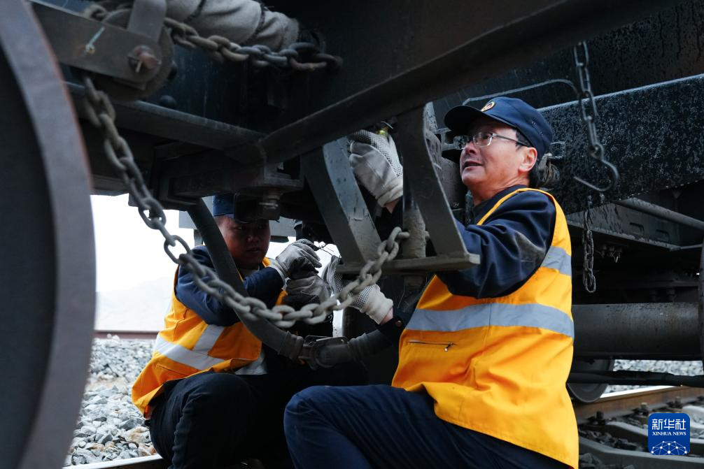 2月4日,韩景泉(右)和徒弟耿永生在放水过程中巡视列车(无人机照片)。