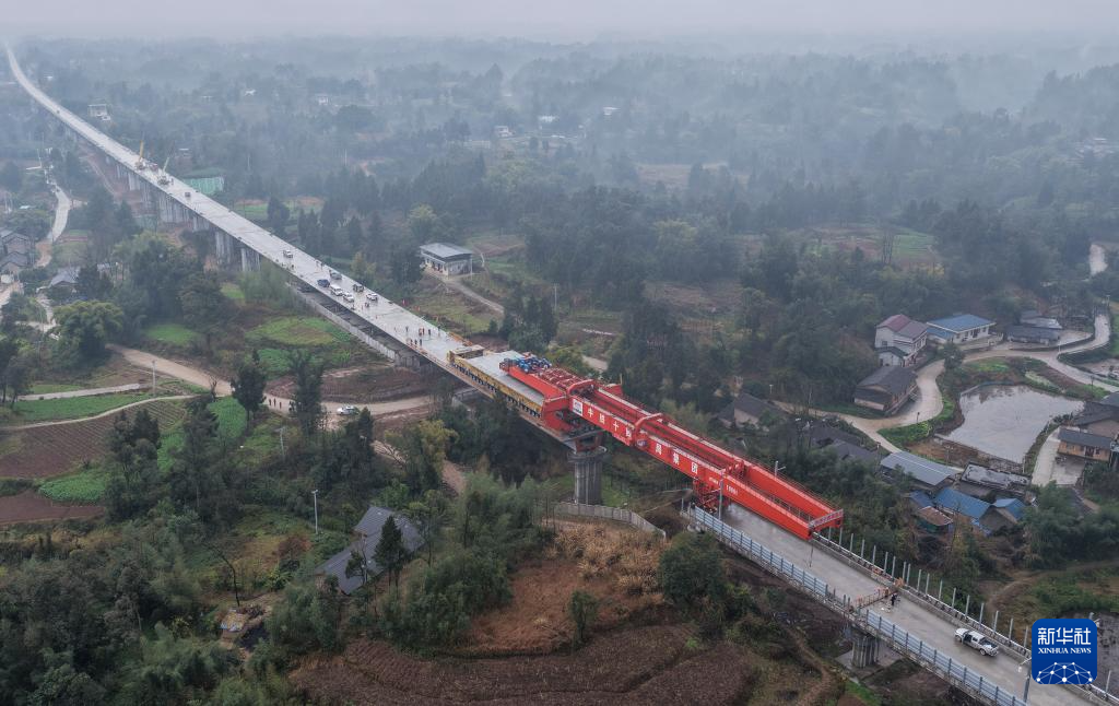 这是2月9日拍摄的成渝中线高铁重庆大足段第419榀箱梁架设现场(无人机照片)。