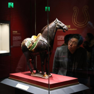 2月10日,参观者在一个三彩马展品前驻足观看。