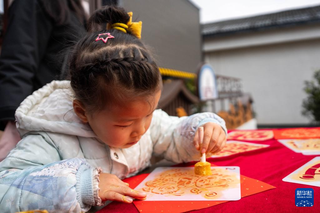 2月10日,一名小朋友在谢家铺镇港中坪村拓年画。